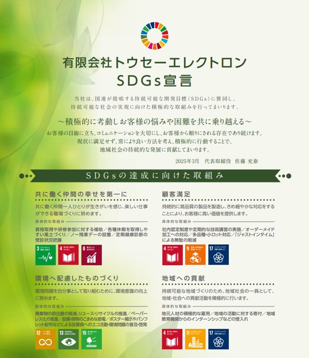 有限会社トウセーエレクトロンは、国連が提唱する持続可能な開発目標(SDGs)に賛同し、持続可能な社会の実現に向けた積極的な取組みを行ってまいります。